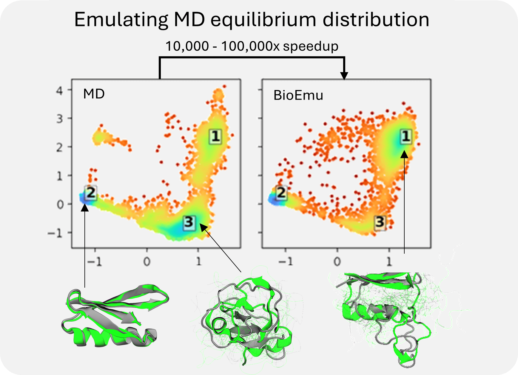 BioEmu-1 emulates equilibrium distribution faster than MD simulation.