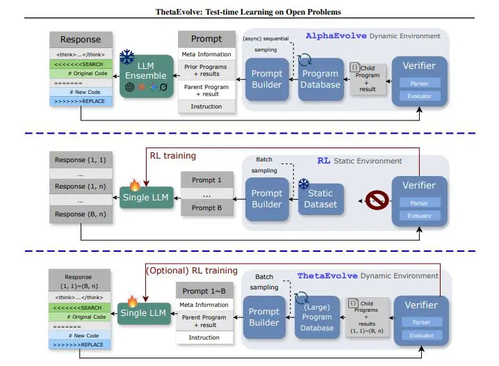 This research introduces ThetaEvolve, a novel approach to program creation and optimisation that combines reinforcement learning with a sophisticated program database. The system aims to enhance program performance on complex tasks by intelligently exploring a diverse range of potential solutions and efficiently reusing successful components. ThetaEvolve leverages reinforcement learning to train an agent that generates and refines programs, guided by a program database managed using MAP-Elites, a technique that maintains a diverse archive of programs, not just those with the highest scores, but also those excelling in different areas. This prevents the system from prematurely settling on suboptimal solutions.