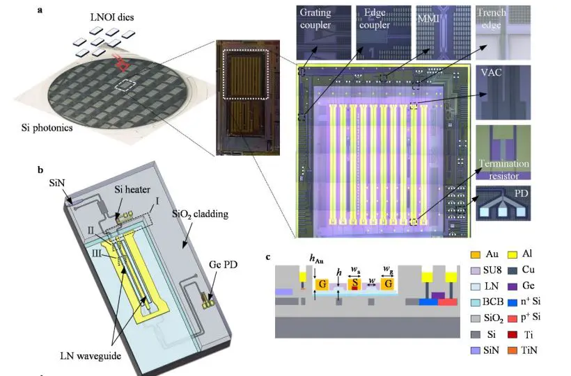 Scientists have achieved a breakthrough in integrated photonics by successfully integrating thin-film lithium niobate (TFLN) with fully functional silicon photonics, establishing a new platform for high-speed optical interconnects. This work demonstrates the first back-end-of-line integration of TFLN onto active silicon via a trench-based die-to-wafer bonding process, allowing for the co-integration of high-performance modulators, photodetectors, and passive components on a single chip. The process introduces TFLN after completing all CMOS-compatible silicon fabrication steps, ensuring compatibility with existing manufacturing techniques. The integrated platform incorporates essential building blocks for optical transceivers, including silicon and silicon nitride passive components, fiber couplers, thermo-optic phase shifters, germanium photodetectors, and multilayer metallization.