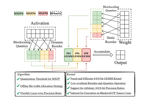 Weights and activations are increasingly converted to the INT4 format. Although the new FP4 Tensor Cores in NVIDIA’s Blackwell architecture offer up to 4× speedup over FP16, existing INT4-based kernels fail to fully exploit this capability due to mismatched data formats. To bridge this gap, researchers propose MicroMix, a co-designed mixed-precision quantisation algorithm and matrix multiplication kernel based on Microscaling (MX) data formats. Tailored for the Blackwell architecture, the MicroMix kernel supports arbitrary combinations of MXFP4, MXFP6, and MXFP8 channels, and produces BFloat16 outputs. To achieve a favourable trade-off between accuracy and efficiency for each linear layer, the team introduces a novel quantisation approach.