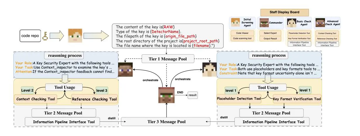 Argus represents a significant advancement in the detection of sensitive information leakage from code repositories. Researchers developed a multi-agent collaborative framework that substantially reduces false positives, a persistent challenge for traditional detection methods relying on simple pattern matching. The system employs a three-tiered detection mechanism, moving beyond basic key identification to incorporate file context and project-level relationships, thereby improving accuracy and minimizing the burden on developers. Experimental results demonstrate Argus achieves high performance, with an accuracy of 94.