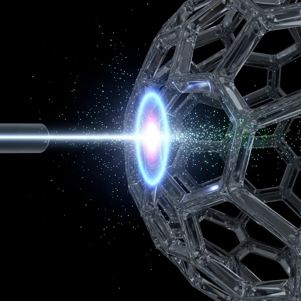 • Focused beam of light intersecting a crystalline material lattice, hybrid glowing particles forming at the interaction boundary